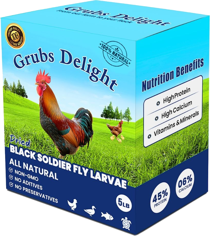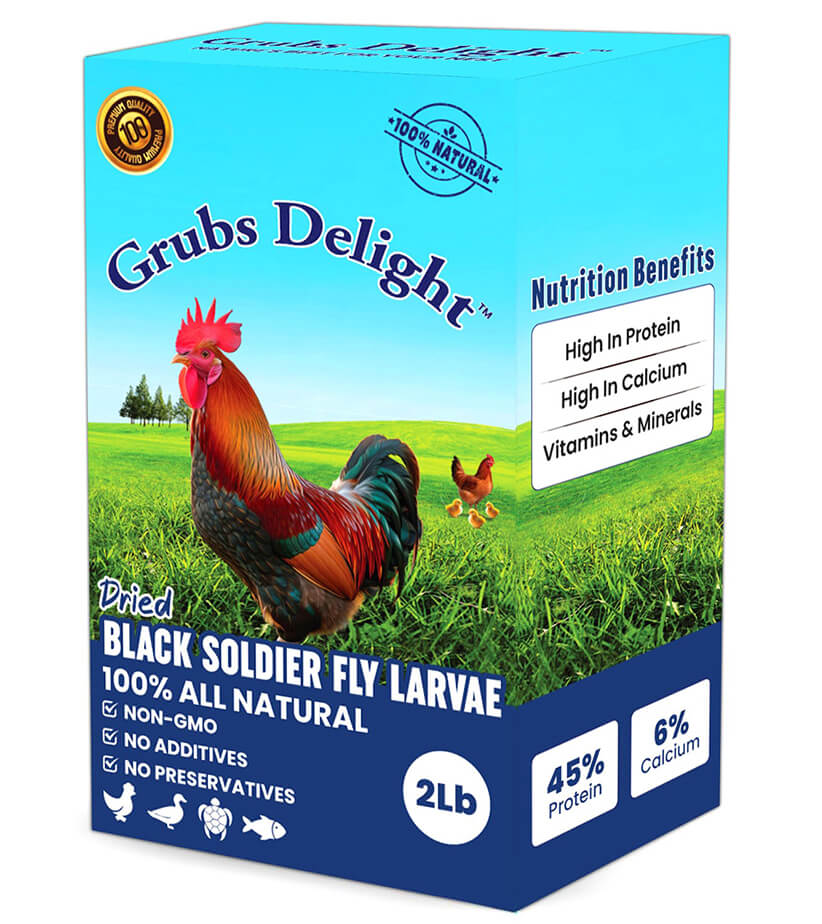 Grubs Delight Dried Black Soldier Fly Larvae. A superfood treat for your feathered friends. High calcium, high-protein, multi-nutrition for stronger eggshells, healthier feathers, and overall immunity support. Up to 85x more calcium than mealworms.